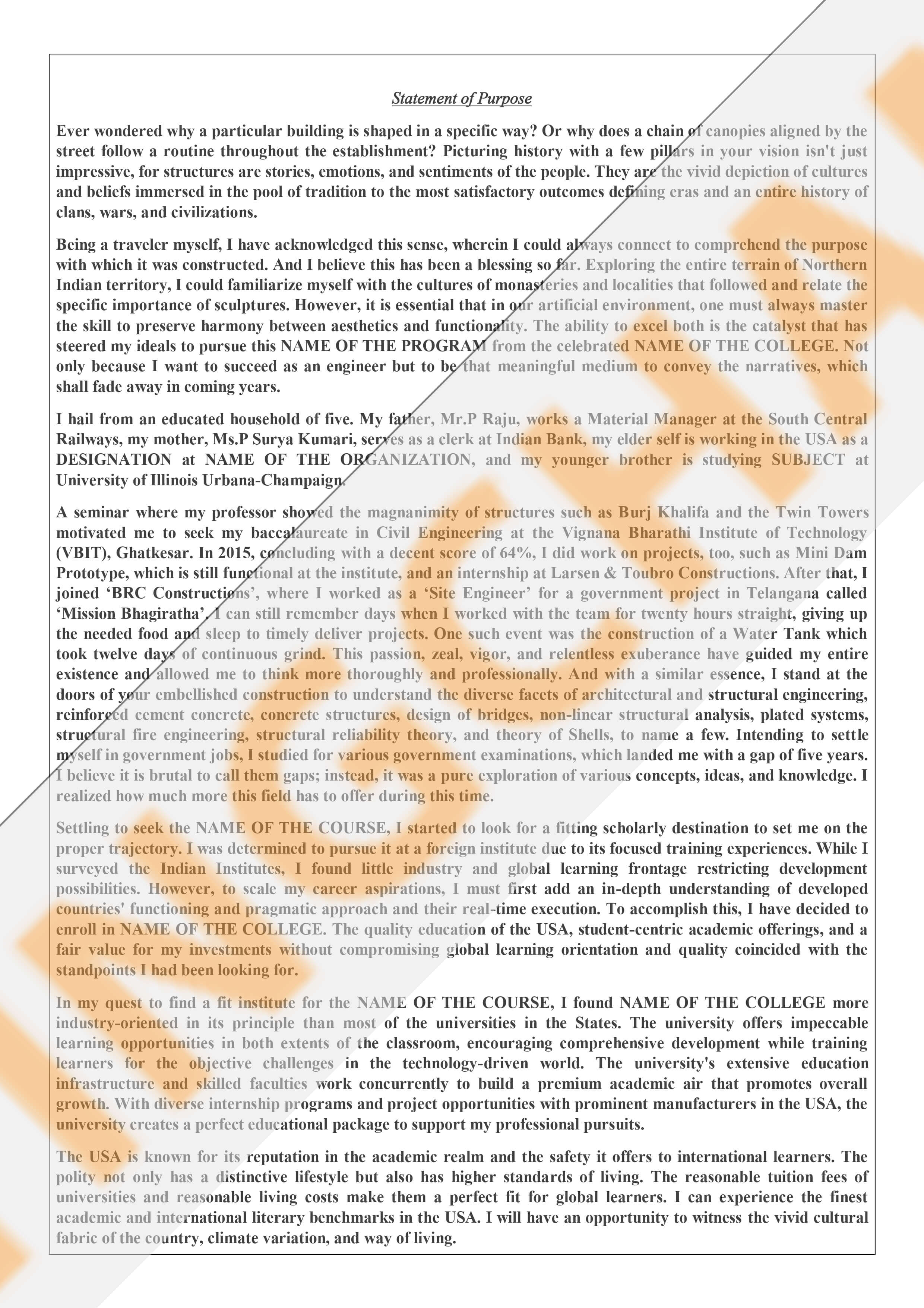 Our company is dedicated to helping individuals achieve their academic and professional goals by providing expert support in crafting application documents. Our SOP Writers specialize in creating tailored Statements of Purpose (SOPs), resumes, study plans, and other essential materials. By aligning each document with the specific requirements of academic programs, scholarships, and visa applications, we ensure our clients' applications stand out. With a focus on personalization and quality, we strive to enhance our clients' chances of success in competitive environments, guiding them toward their desired opportunities.